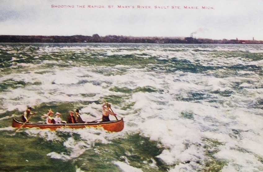 They encountered the rapids in the St. Mary's River that required them to portage their canoes and other small craft around the shallow turbulent rapids.